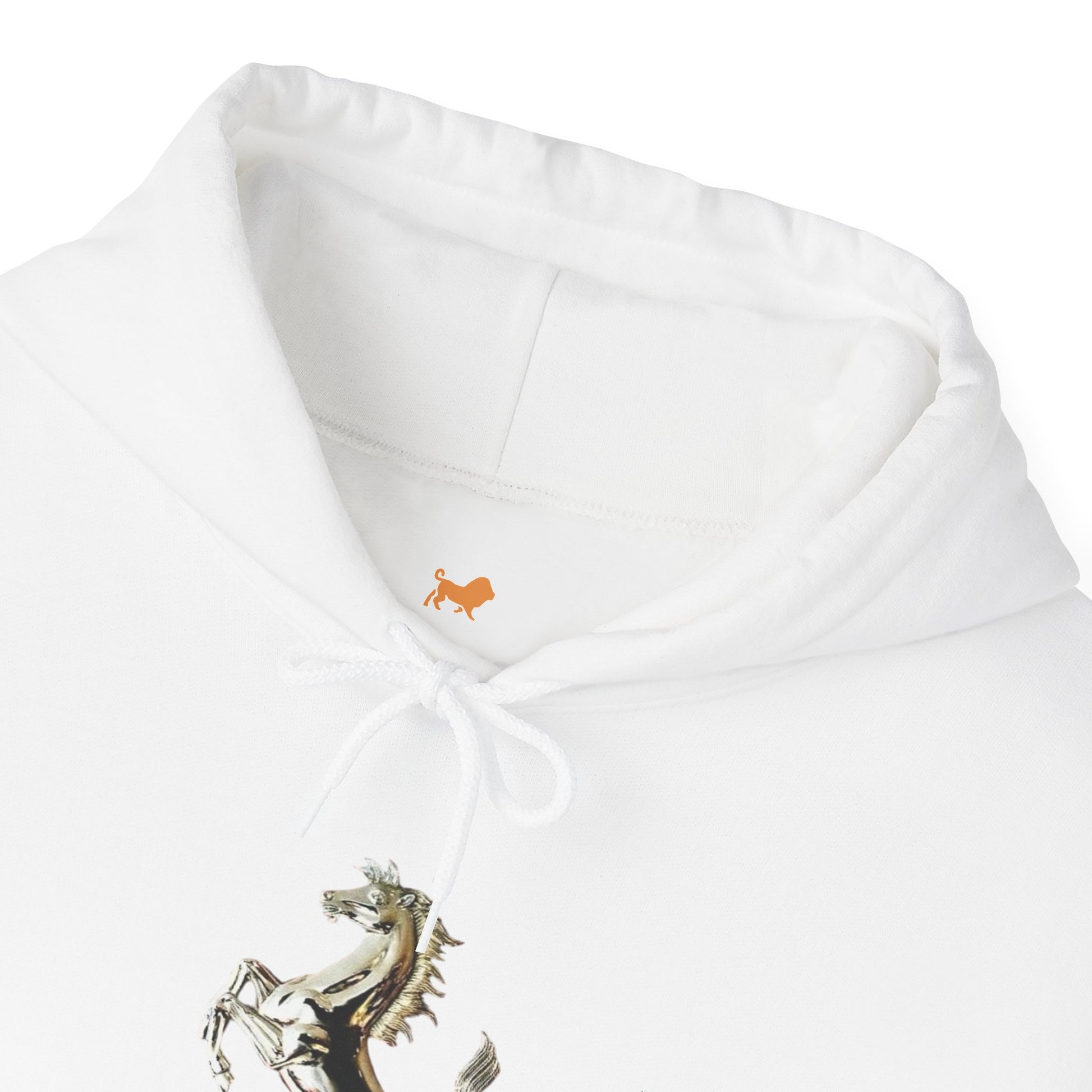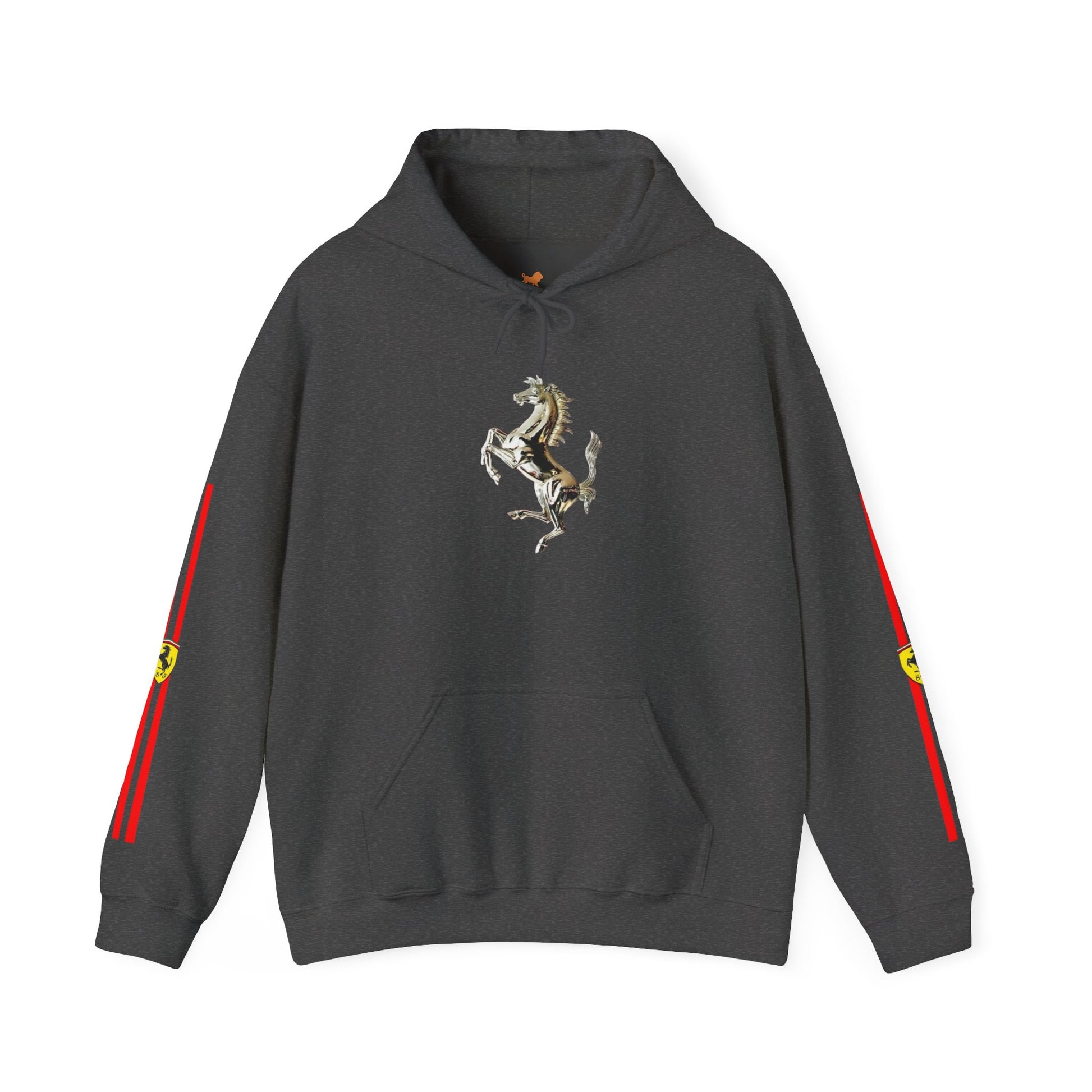 This heavyweight hoodie channels vintage motorsport energy with crisp, minimalist branding. A muted prancing-horse emblem anchors the front, while the back features a faded race-poster style print that feels like a found photograph from the paddock. Red racing stripes and crest accents run down each sleeve, giving the piece a raw, track-day attitude without shouting. Wear it when you want something warm and substantial that still reads like a collectible — a layered staple for chilly mornings, garage nights, or wandering city streets after a race-day screening.